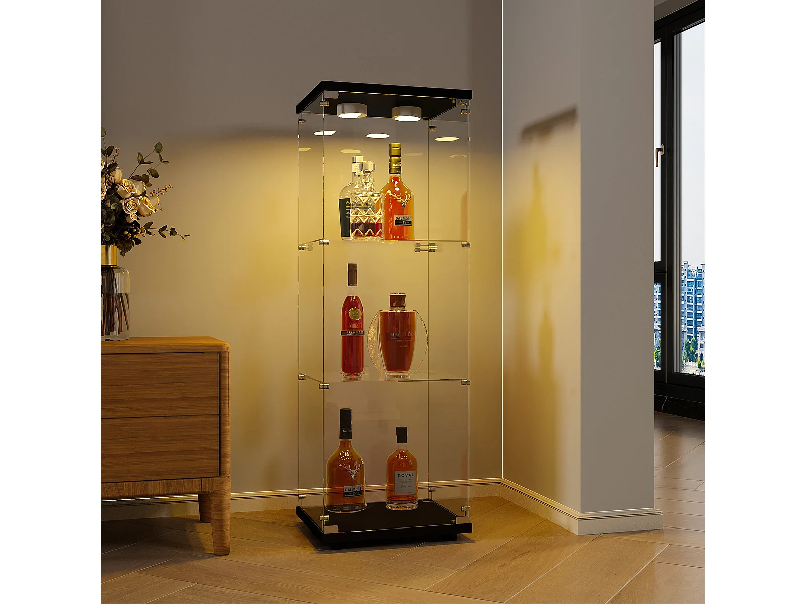 Vitrine en verre à 5 étagères avec éclairage LED personnalisable – Base noire