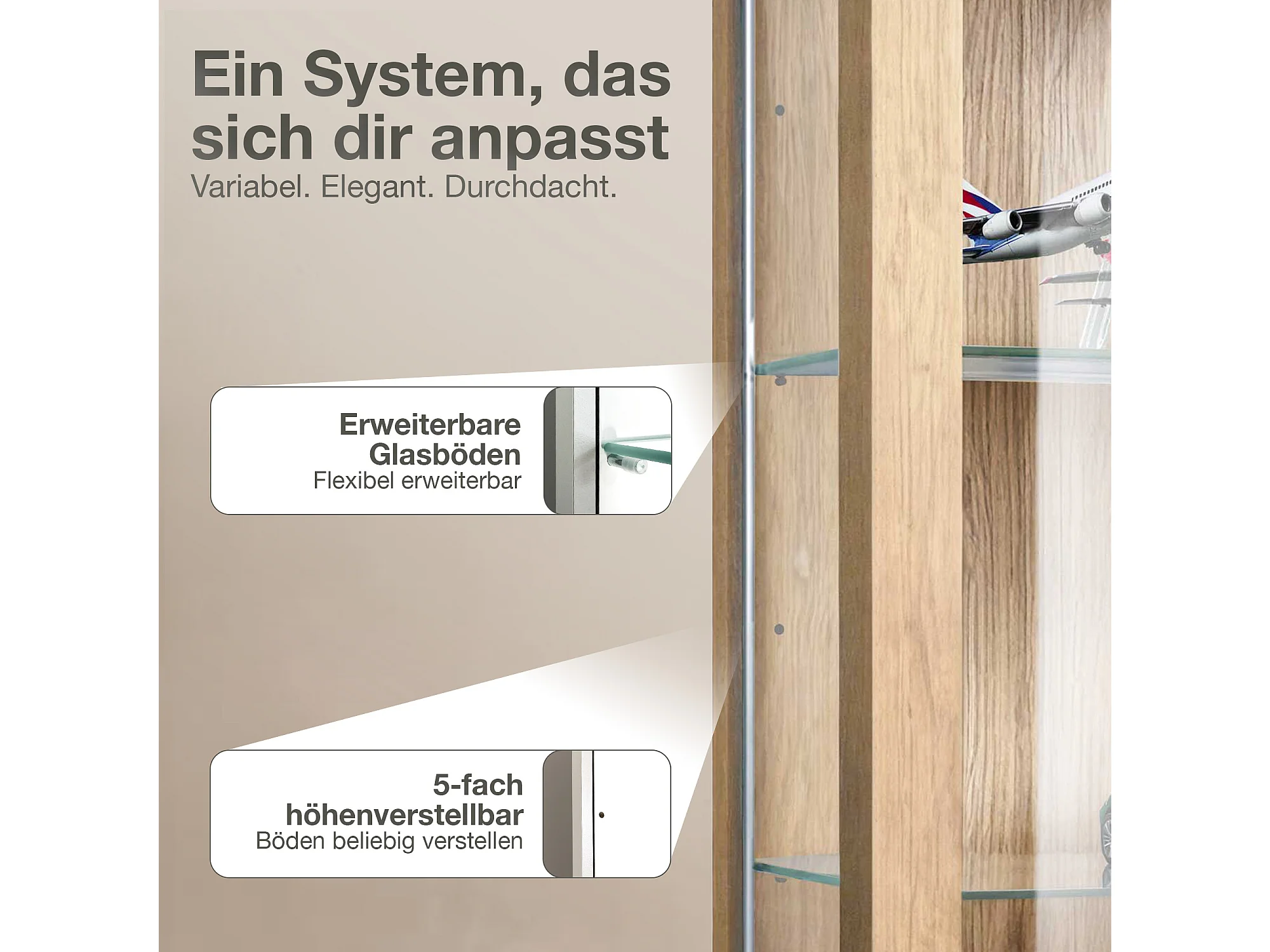 Vitrine sur pied avec 2 portes, 4 étagères en verre réglables en hauteur - Avec éclairage LED - 176x67x33 cm - Couleur hêtre