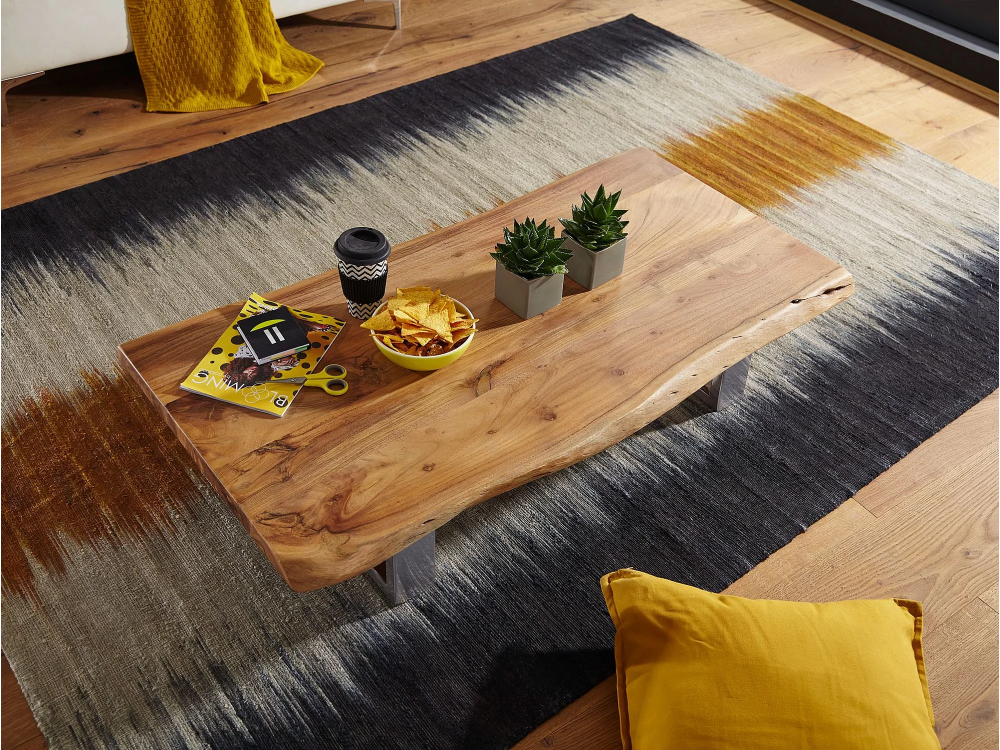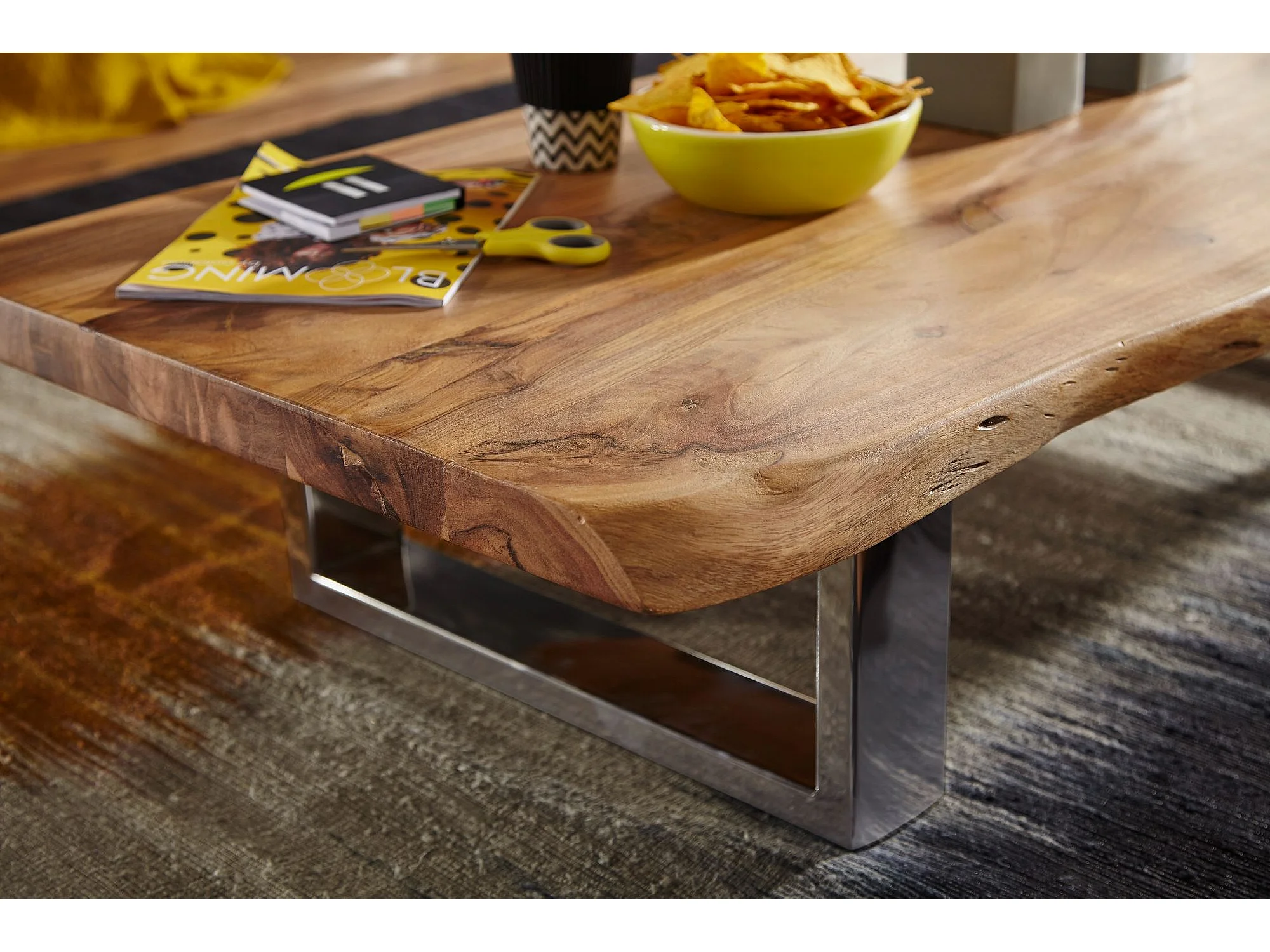 Table basse 115 x 25 x 58 cm acacia massif cadre en métal grande, table de salon tronc d'arbre