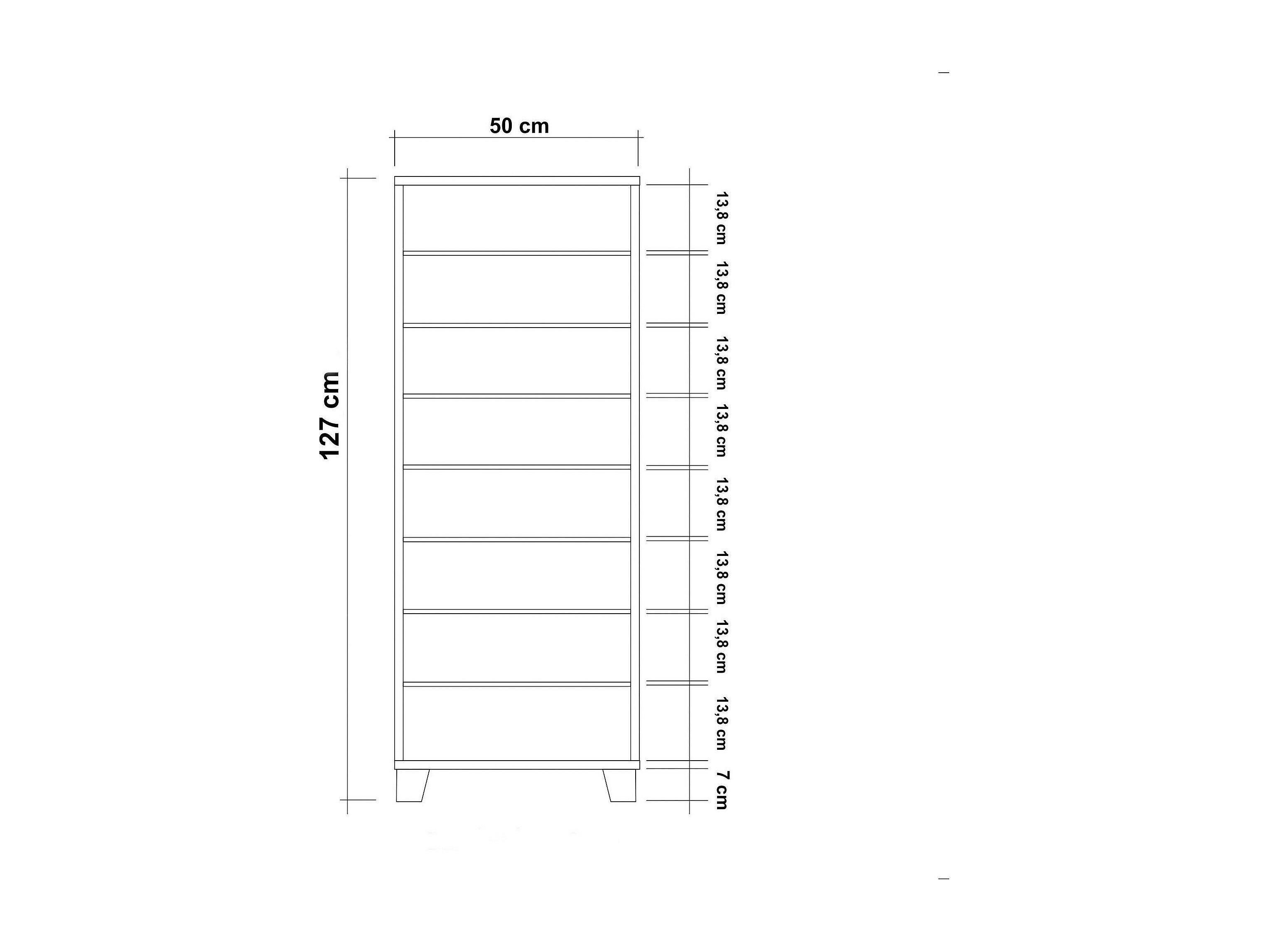 DIMENSIONES EN CM - Zapatero : Longitud: 50 Anchura: 38 Altura: 127 - Dimensiones adicionales: Alto estante: 13,8 cm - Alto patas: 7 cm
